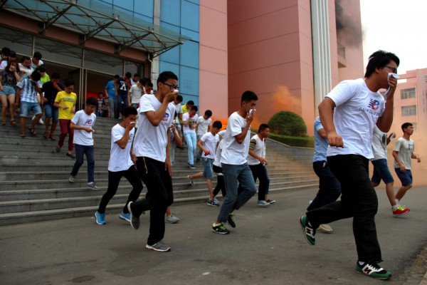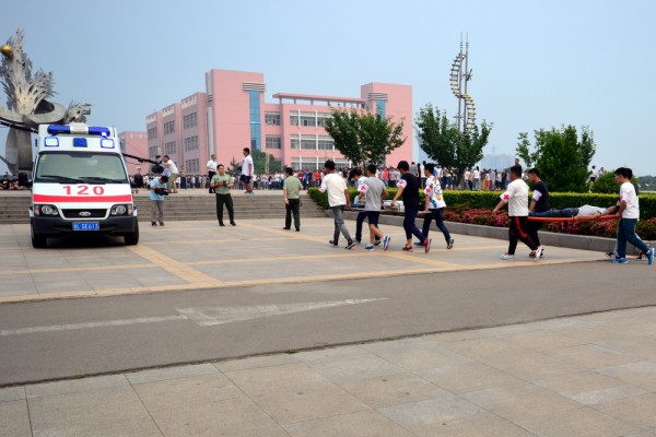 下午14时40分,随着尚梦平副厅长一声令下,演练正式开始。演练模拟学院上德楼发现火情。保卫科接到报警后,第一时间向119消防指挥中心报警并报告总指挥,总指挥收到报警后立即下达命令,启动火灾事故疏散逃生预案、疏散学生、组织灭火。随即警报响起,电工切断电源,灭火组第一时间用灭火器灭火,疏散导护组迅速组织上德楼内师生拿着湿毛巾捂住口鼻,弯腰迅速从两个安全通道撤离至楼外安全地点集合,整个过程迅速有序。各楼层义务消防员在确认本层人员全部安全撤离后,也迅速至指定地点报告疏散撤离情况。日照市消防大队消防员利用高压水枪对起火点进行灭火;医疗救护组到达救护现场后,组织救护队员进入教学楼将4名受伤人员抬出后进行紧急救护,随后抬上救护车送往医院救治;人员清点组清点人数及伤员情况并报告总指挥。14时48分演练圆满结束。