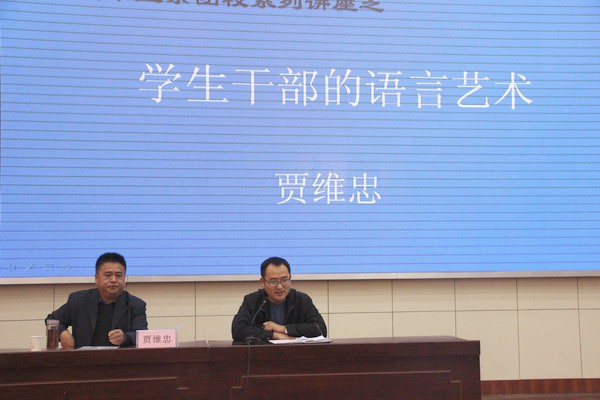 贾维忠从口语的特征、语言表达的要求、学生干部的演讲艺术三方面讲述了学生干部的语言艺术。他首先用了许多生动的例子告诉大家,面对不同的场合和不同的表达对象,应该如何使语言生动有趣、节奏跌宕起伏;接下来跟大家分享了学生干部的语言艺术中有关演讲方面的技巧,讲述了演讲的基本特征、艺术特点以及演讲技巧的运用等。他强调演讲的内容要生动感人,题材要紧扣主题、真实典型,希望学生干部要博览群书,广泛涉猎,能够用睿智的语言表达自己的观点。为了让同学们更加直观深刻的体会到语言的魅力,贾维忠还即兴为大家朗诵诗词,感受语言的无穷魅力。