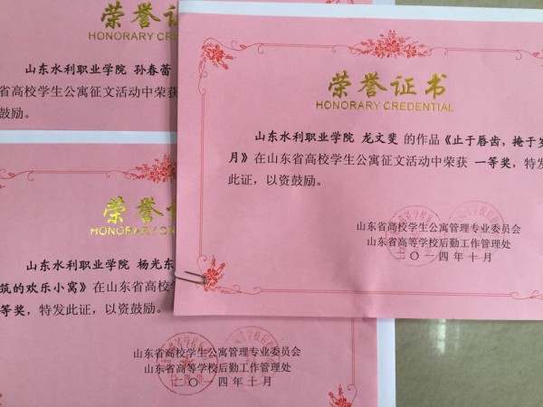 近日,由山东省高校学生公寓管理专业委员会、山东省高等学校后勤工作管理处联合主办的2014年山东省“高校学生公寓征文活动”评选结果揭晓,我院机电工程系龙文斐同学的作品《止于唇齿,掩于岁月》在全省127所高校选送的诸多作品中脱颖而出,荣获一等奖。