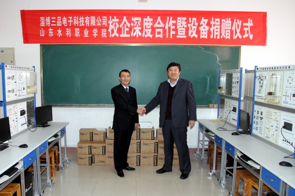 11月13日上午,我院在PLC实训室举行淄博三品电子科技有限公司实训设备捐赠仪式,淄博三品电子科技有限公司总经理陈建敏、学院院长于纪玉、院办公室刘秋生、机电工程系主要负责人以及部分老师代表参加了此次活动。该公司继去年3月份向我院捐赠10余万元设备后,今年再次捐赠价值10余万元的最新型高性能矢量变频器设备,同时也是为第七届全国水利高等职业院校“齐鲁杯”技能大赛进行赞助的单位之一。
