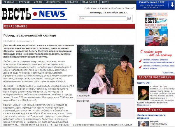 近日,俄罗斯卡卢加州《消息报》全文刊登了一篇由我院外教Галина Пашина副教授撰写的文章,向俄罗斯读者全面地介绍和描述了她任教的304am永利集团官网、中俄合作办学、学院周边及日照城市风情等相关情况。