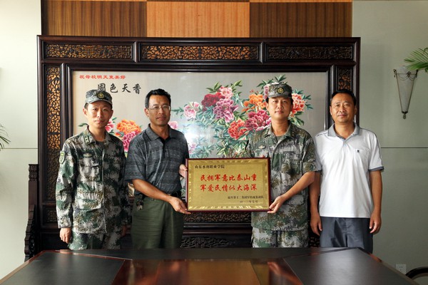 8月1日上午,在日照参加海训的南京军区某部特战集训大队向我院赠送写着“民拥军意比泰山重,军爱民情似大海深”的牌匾,感谢我院为配合部队在海上训练所做的工作。学院党委副书记赵明阁代表学院接收了牌匾,并表示学院会一如既往支持部队建设和训练工作,持续不断为执行海训任务的部队提供最优质的保障。