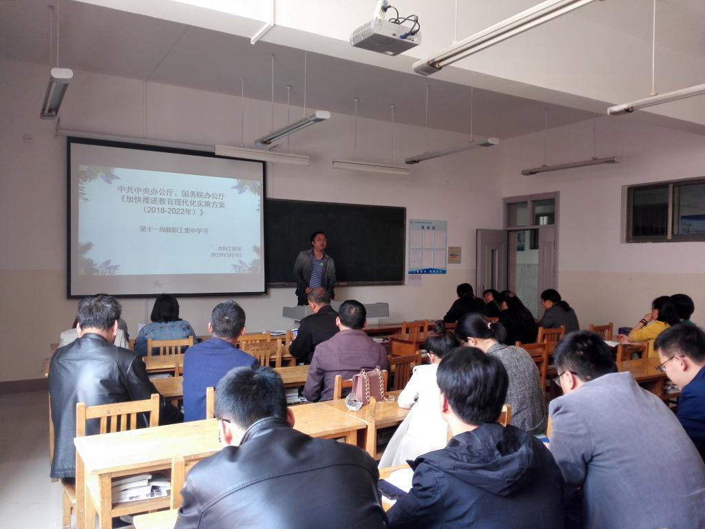 2019年5月9日15:00时水利工程系全体教职工在7210教室集中学习了中共中央办公厅、国务院办公厅《加快推进教育现代化实施方案(2018-2022)》(以下简称“实施方案”),水利工程系副主任刘冬峰带领大家共同学习了文件。