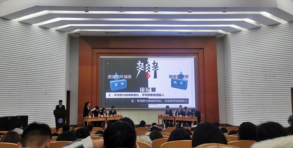 本次辩论赛辩题正方为“夸夸群与喷喷群相比,夸夸群更能激励人”,反方为“夸夸群与喷喷群相比,喷喷群更能激励人”。比赛过程中,正方慷慨激昂、反方充满理性色彩的自我介绍后,比赛进入开篇立论环节。正方辩手们凭借精辟的措辞、犀利的言语,展现出咄咄逼人的气势,反方辩手也毫不示弱,见缝插针,展开反攻。在随后的攻辩环节中,双方更是争锋相对、步步紧逼,现场气氛迅速升温,达到白热化阶段。