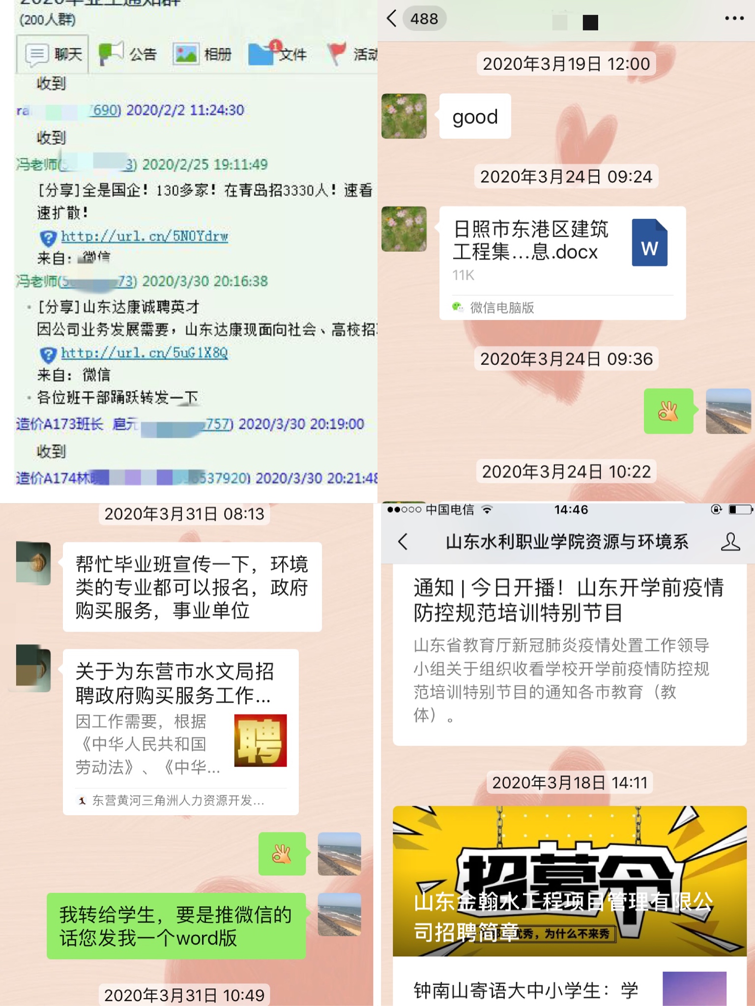 就业问题就是民生问题,资源与环境系2020届毕业生就业工作紧锣密鼓进行中。疫情严峻,我系积极响应学院号召,通过线上招聘信息和就业指导活动,利用新媒体平台促就业,打好就业主动仗。进入毕业季以来,我系教师多方联系用人单位,结合“赢在水院”微信服务号等平台,多渠道向毕业生推送招聘信息。
