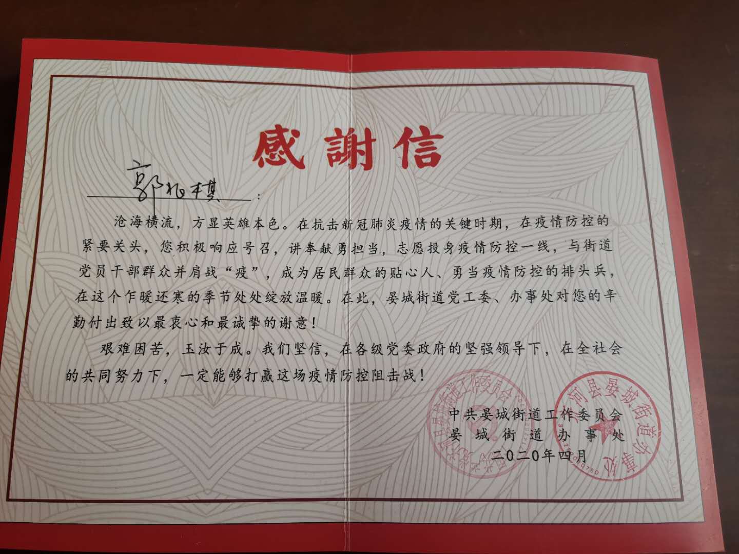 4月23日,中共晏城街道工作委员会、晏城街道办事处给我校资源与环境系造价A193班学生郭兆棋发了感谢信,对该同学在街道社区疫情防控中的优秀表现给予了高度赞扬。