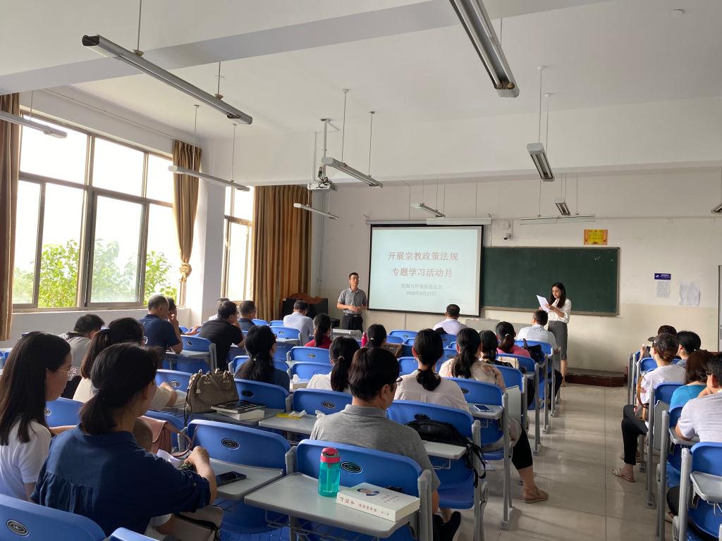 为深入学习贯彻习近平总书记关于宗教工作重要讲话精神,加强师生对党的宗教政策、形势与热点问题的了解和认识,帮助师生正确看待宗教信仰问题,树立正确的宗教观念,资源与环境系根据中共日照市委组织部《关于在全市党支部中开展宗教政策法规专题学习的通知》、学院党委《关于开展宗教政策法规专题学习活动月的通知》,8月27日下午,资源与环境系举办宗教政策法规专题学习活动月启动仪式。启动仪式由资源与环境系党总支成员谢元峰主持,全体教师参加。