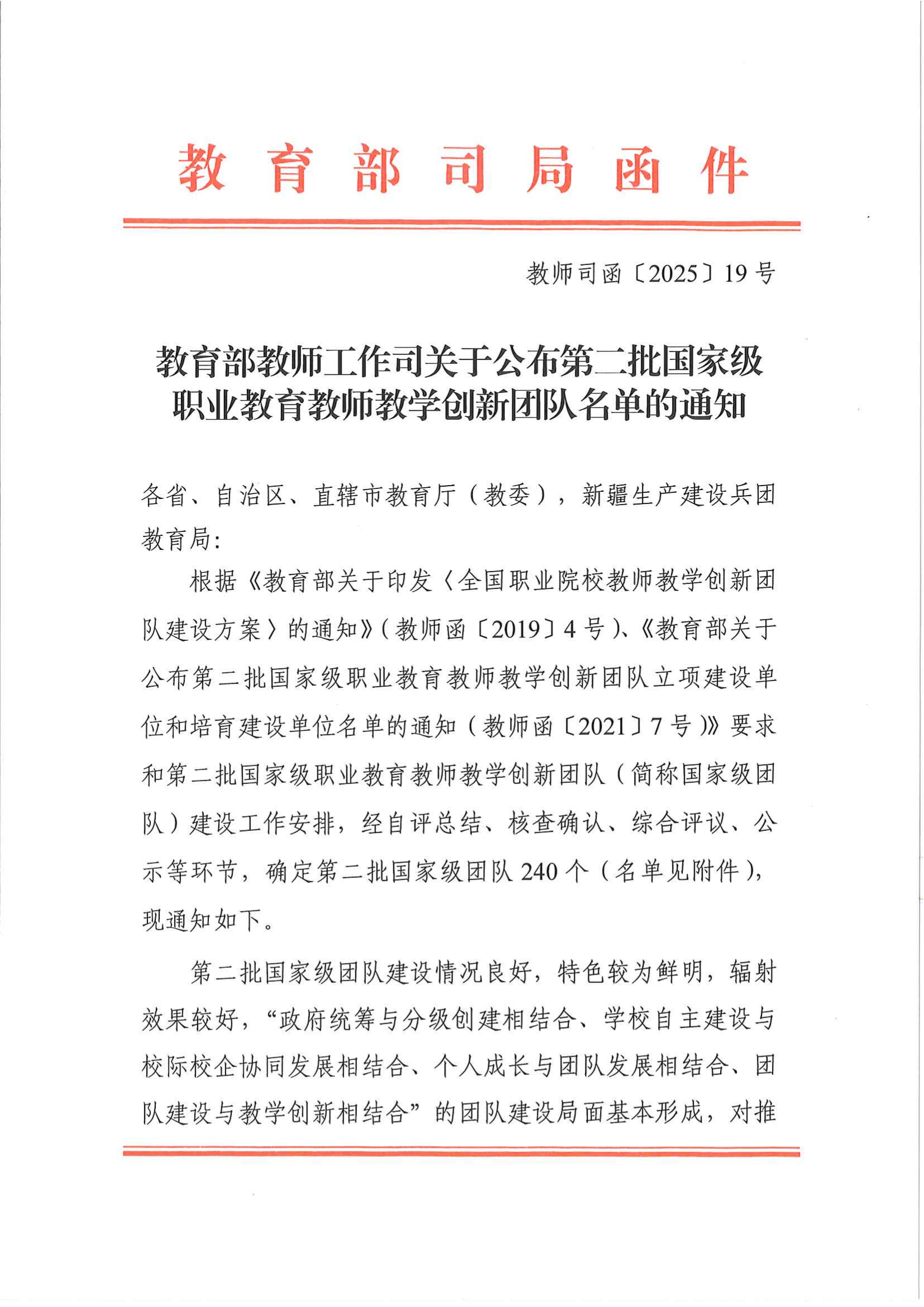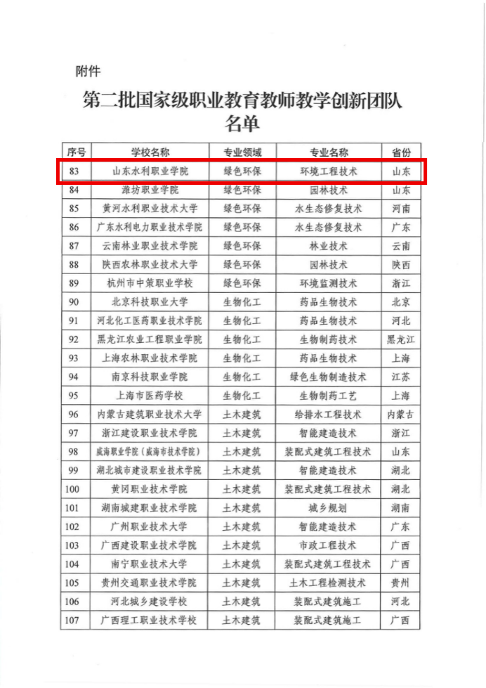 近日,教育部教师工作司发布《关于公布第二批国家级职业教育教师教学创新团队名单的通知》(教师函〔2025〕19号),我院环境工程技术教学团队经过自评总结、核查确认、综合评议及公示等环节,顺利通过验收,被确定为第二批国家级职业教育教师教学创新团队。